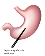 La section de l’estomac pour confectionner ce manchon (Sleeve en anglais) se fait toujours par agrafage de l’estomac à l’aide d’une pince automatique introduite par cœlioscopie.