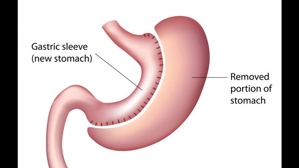 L’intervention consiste à retirer les 3/4 de l’estomac, un tube introduit par la bouche pendant l’intervention par l’anesthésiste et descendu dans l’estomac sert à calibrer la taille du nouvel estomac ; on coupe celui-ci le long de la sonde et dans le même temps la pince automatique suture la tranche de section de l’estomac ; on pose ainsi une triple rangée d’agrafes. (Malgré cela il existe toujours un risque (rare) de mauvaise ou d’absence de cicatrisation sur la tranche de section. Il peut ainsi apparaître une fistule avec fuite du contenu gastrique dans le « ventre », complication entraînant réintervention, drainage, mise en place de prothèse).